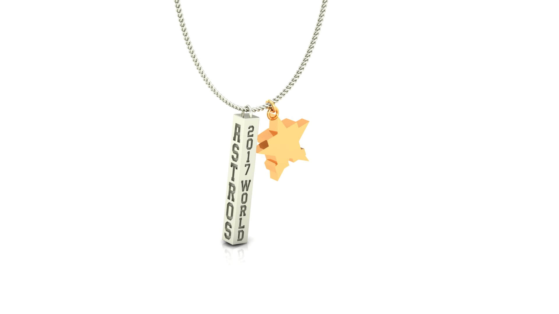 This Houston Astros bar necklace is the latest in championship fan jewelry. The sleek design features orange stones on the front. Beautifully displayed on the other sides of the necklace are the statements "2017 World", "Champions" and "Astros". Available in Durilium, Gold Durilium, white gold and Yellow Gold.
